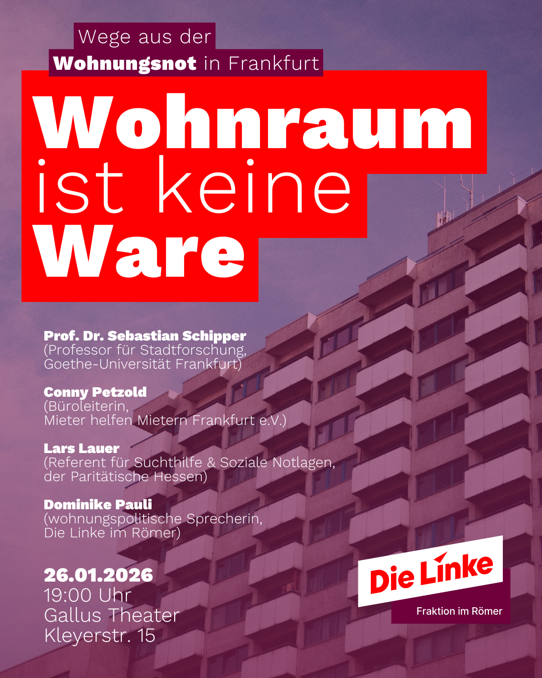Wohnen macht arm. Die Mieten explodieren. Immer mehr Menschen finden keine bezahlbare Wohnung. Warum? Einerseits werden kaum neue günstige Wohnungen geschaffen: In letzten fünf Jahren wurden nur 614 Sozialwohnungen gebaut. Gleichzeitig sind über 3.000 Sozialbindungen ausgelaufen. Zudem stehen Tausende Wohnungen leer, bleiben ungenutzt und werden dem Verfall preisgeben. Wenn gebaut wird, dann zumeist teuer. Bezahlbarer Wohnraum ist und bleibt in Frankfurt Mangelware.