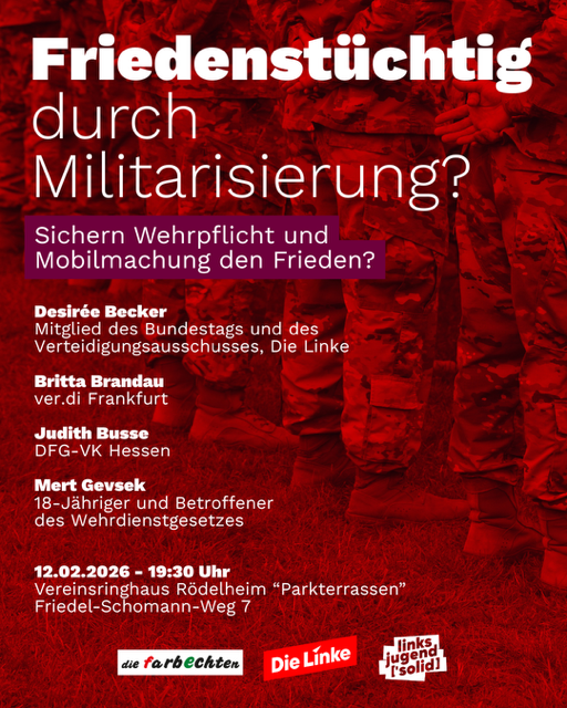 Am Donnerstag, den 12. Februar 2026, um 19:30 Uhr kommen dazu im Vereinsringhaus Rödelheim (Parkterrassen), Friedel-Schomann-Weg 7, unterschiedliche Perspektiven zusammen. Es diskutieren Desirée Becker, Mitglied des Bundestages und des Verteidigungsausschusses für DIE LINKE, Britta Brandau von ver.di Frankfurt, Judith Busse von der DFG-VK Hessen sowie Mert Gevsek, 18-jährig und unmittelbar vom Wehrdienstgesetz betroffen. Die Veranstaltung bietet Raum für Information, Austausch und eine kritische Debatte über Friedenspolitik, Wehrpflicht und gesellschaftliche Verantwortung. Alle Interessierten sind herzlich eingeladen, kommt vorbei!