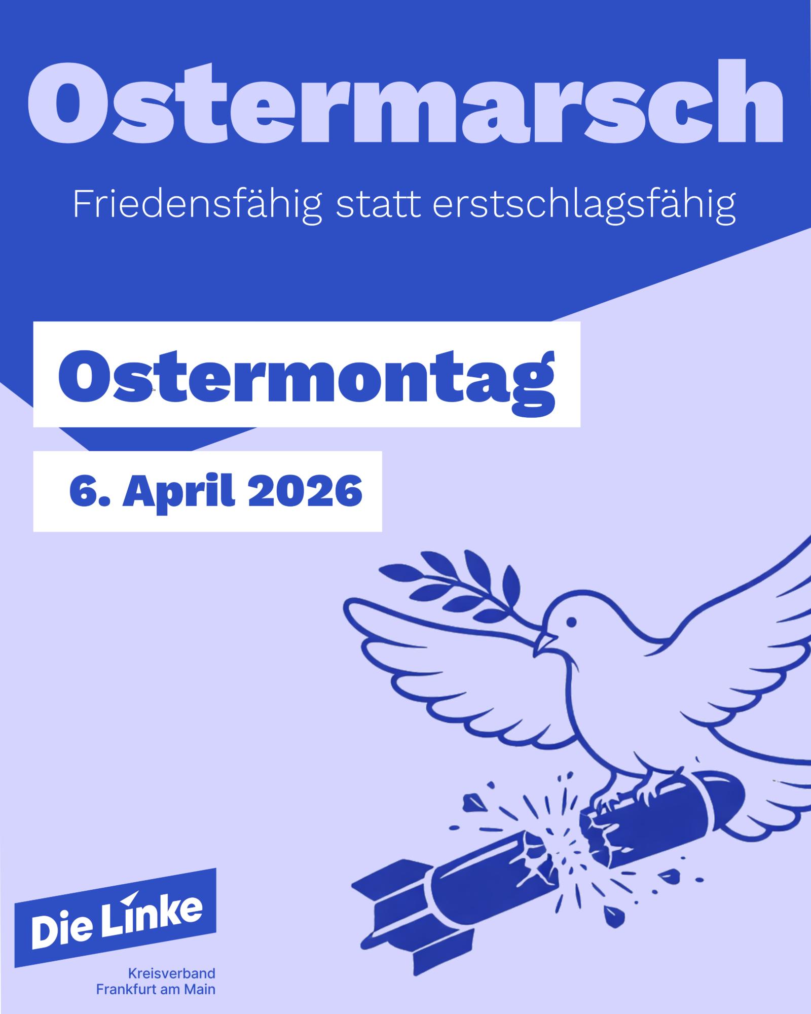 Auch in diesem Jahr findet rund um Ostern wieder der traditionelle Ostermarsch statt. In Frankfurt wird es am Ostermontag, den 6. April 2026, mehrere Aktionen und Treffpunkte geben, die wir als Kreisverband der LINKEN unterstützen und zu denen wir zur Teilnahme aufrufen.