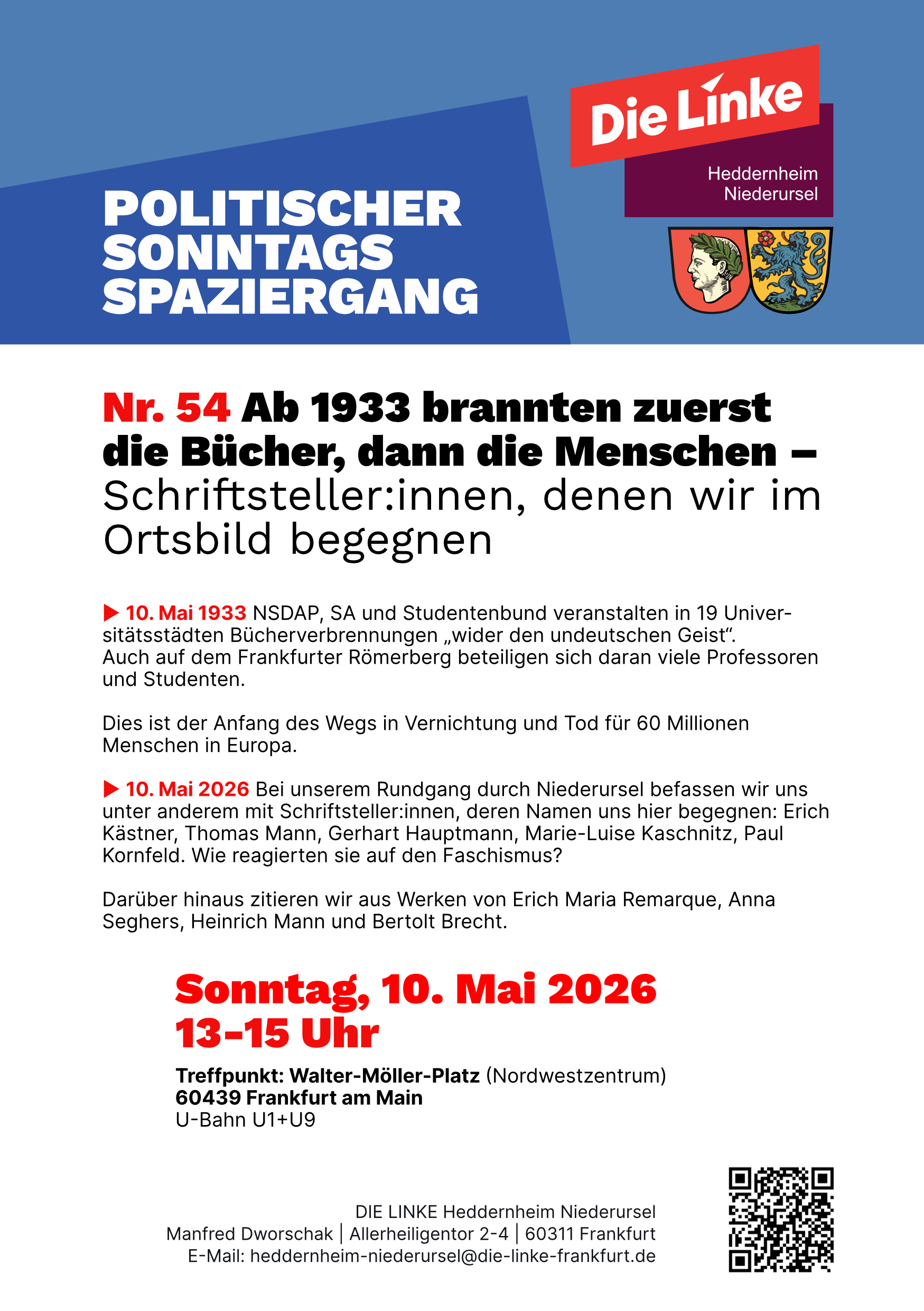► 10. Mai 2026 Bei unserem Rundgang durch Niederursel befassen wir uns unter anderem mit Schriftsteller:innen, deren Namen uns hier begegnen: Erich Kästner, Thomas Mann, Gerhart Hauptmann, Marie-Luise Kaschnitz, Paul Kornfeld. Wie reagierten sie auf den Faschismus?