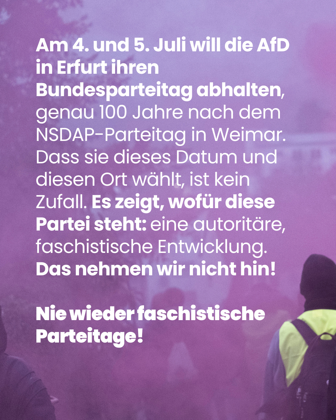 Am 4. und 5. Juli will die AfD in Erfurt ihren Bundesparteitag abhalten, genau 100 Jahre nach dem NSDAP-Parteitag in Weimar. Dass sie dieses Datum und diesen Ort wählt, ist kein Zufall. Es zeigt, wofür diese Partei steht: eine autoritäre, faschistische Entwicklung. Das nehmen wir nicht hin!